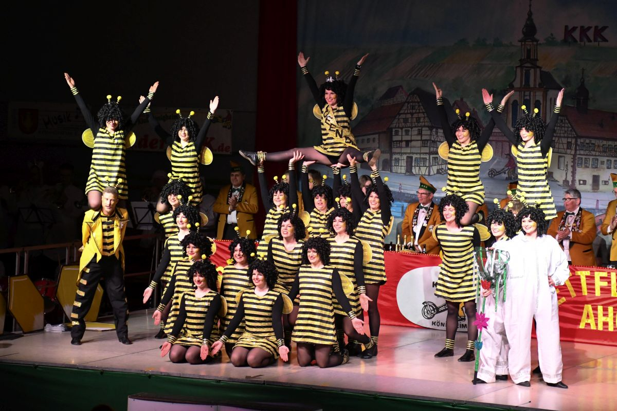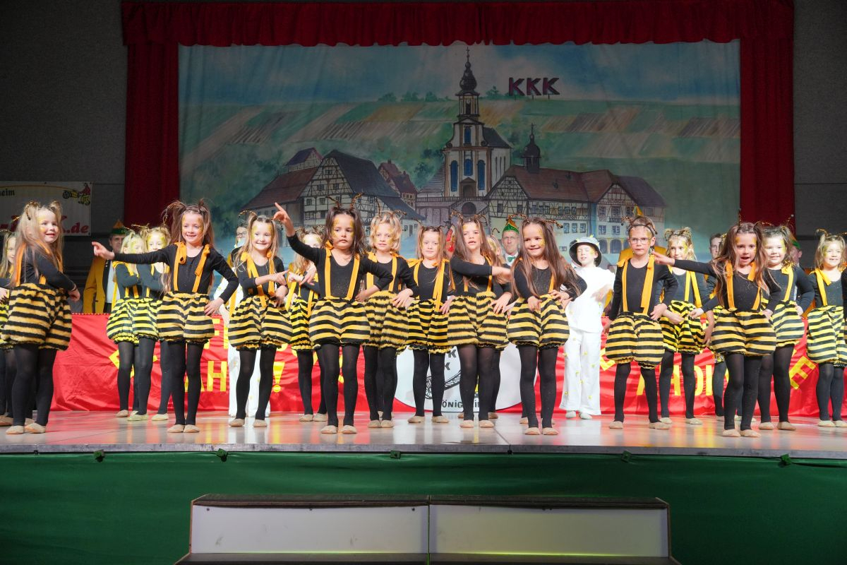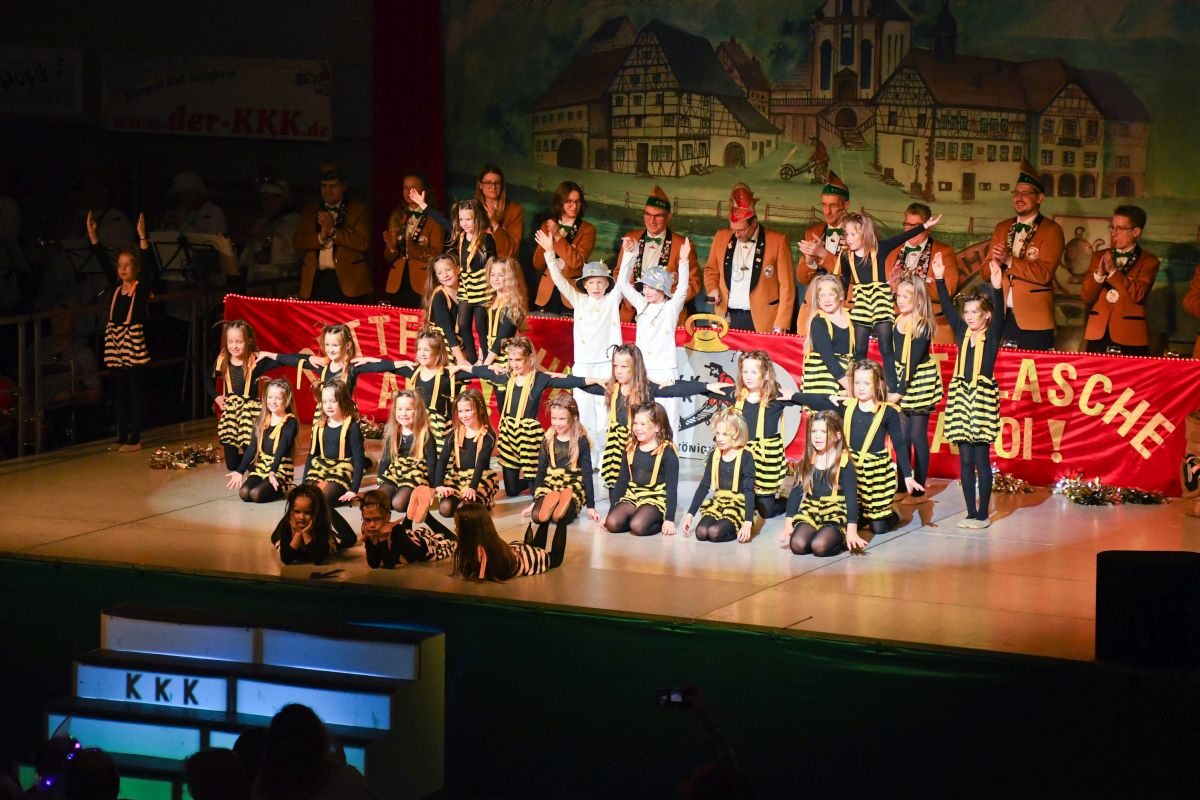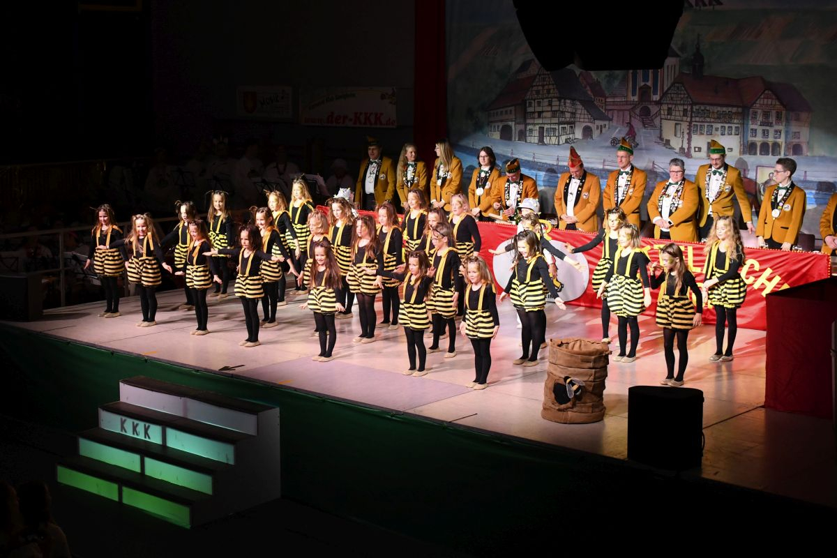 Der Abend in der vollbesetzten Brehmbachtalhalle begann mit dem Einzug des Elferrats samt Garden und zahlreichen Gastabordnungen befreundeter Fastnachtsvereine. Nach der Begrüßung der Gäste durch die beiden Präsidenten gehörte die Bühne der Bettflaschengarde des KKK. Die jüngsten Tänzerinnen und Tänzer schwirrten als Bienenschwarm über die Bühne und erzählten die Geschichte des Honigs. (Trainerinnen: Lea Hofmann, Tabea Haubelt und Laura Bauer)