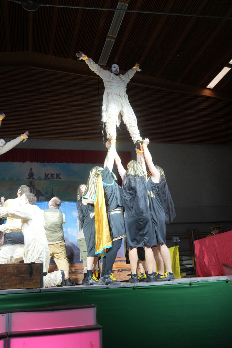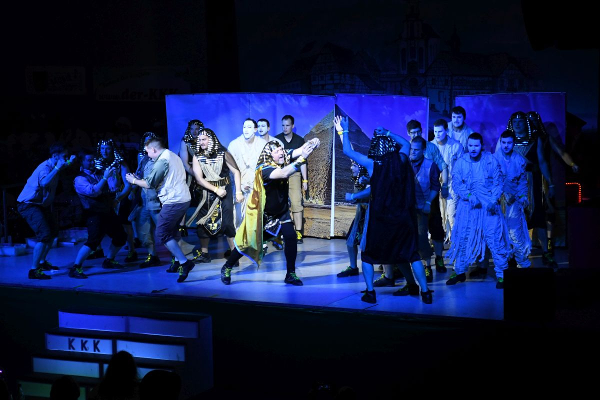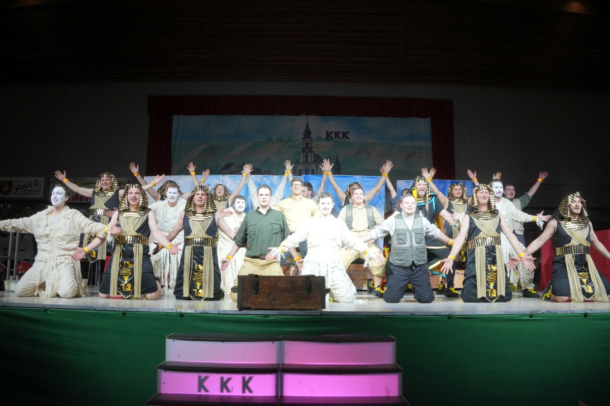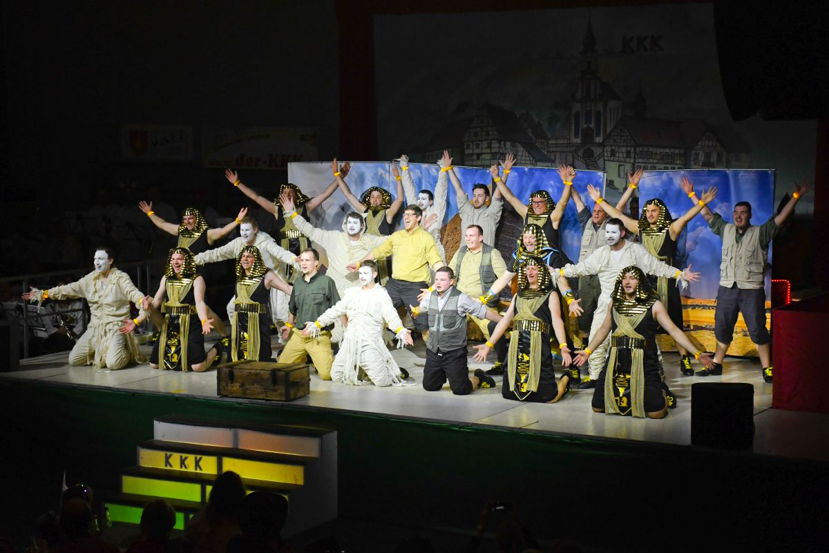 Bütt und Tanz wechselten sich anschließend in gewohnt harmonischer Weise ab. Otmar Schraud sorgte, als „kleiner Bub“ mit viel Wortwitz für die ersten schallenden Lacher im Saal, bevor das Männerballett aus Hainstadt das Publikum in die trockene Wüste Ägyptens führte und gemeinsam mit ihm das Geheimnis des Amuletts suchte, womit es bewies, dass auch Männer tänzerische Höchstleistungen vollbringen können. (Trainerinnen: Michaela Büchler und Diana Schwarz-Berberich) Anschließend ging es mit der Samstag-Abend-Show, moderiert von Andreas und Antonia Poser der Lustigen Vögel aus Schweinberg, live ins Programm. Emotional wurde es bei der Schautanzgruppe der Brogge aus Merchingen, die mit ihrem Motto „Im Käfig meines Kopfes“ eine vielschichtige Gedankenwelt zum Leben erweckte. (Trainerinnen: Lena Zeitler und Tamara Beckmann) Ehe die Königheimer Musikkapelle bei einer Schunkelrunde die gesamte Brehmbachtalhalle in Bewegung brachte. Sportlich-elegant ging es mit dem Tanzmariechen Fe Kohler der Narrhalla Boxberg weiter, das mit akrobatischen Elementen und flottem Tanz über die Bühne hüpfte. (Trainerinnen: Milena Haffner und Corinna Hahn)