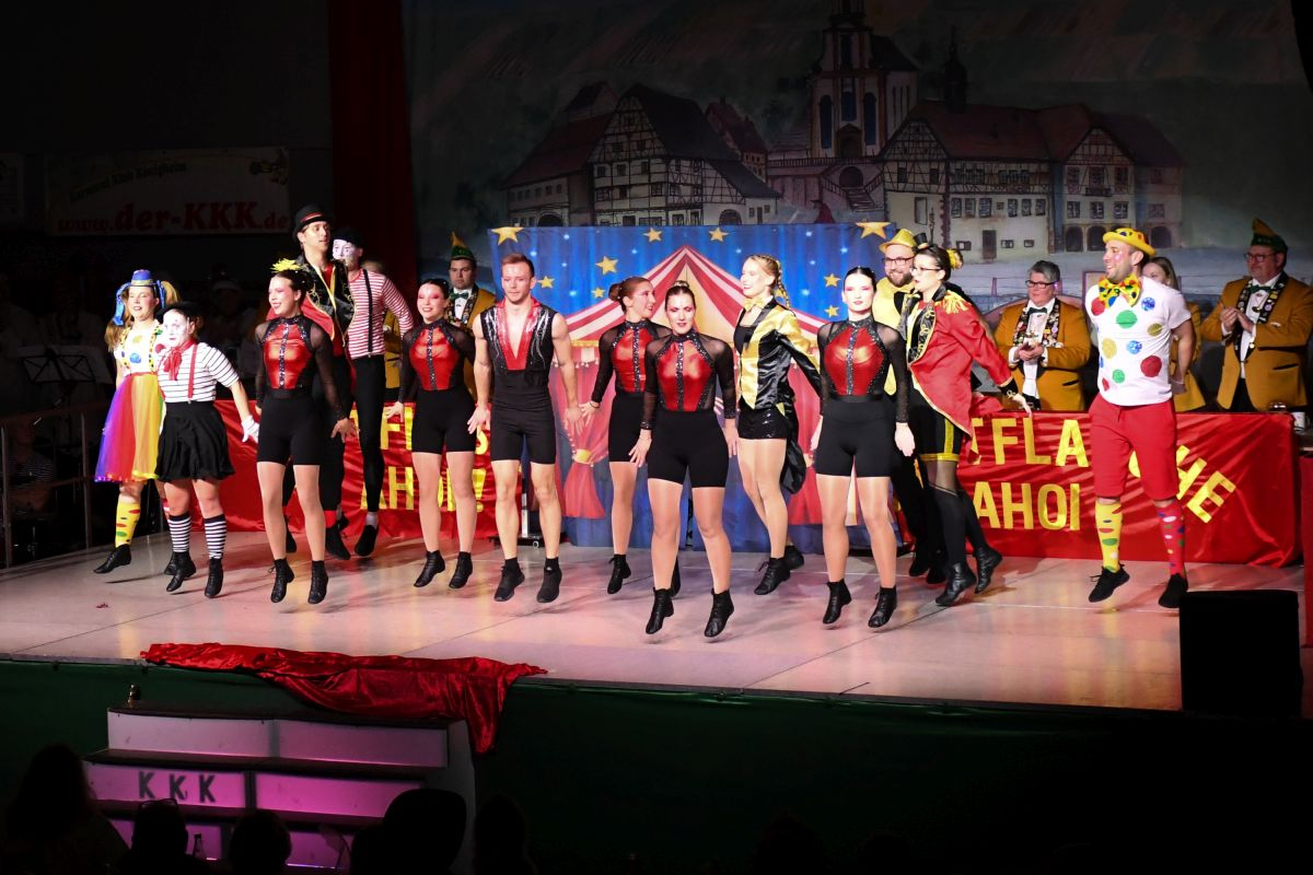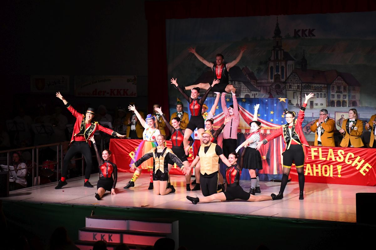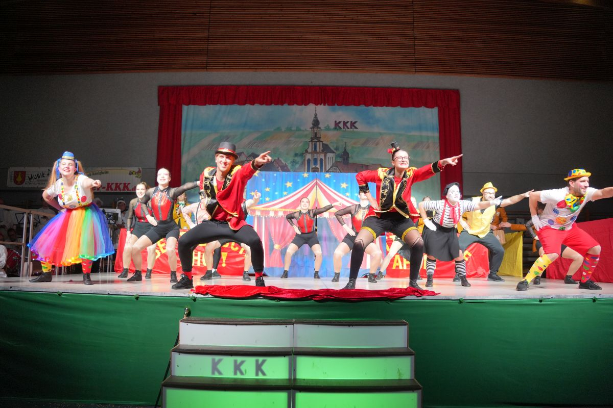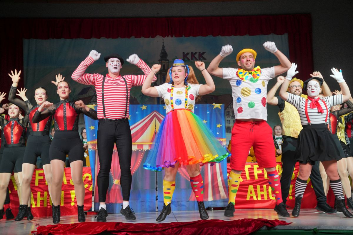Ehe sich die Brehmbachtalhalle in ein Zirkuszelt mit Akrobaten, Pantomimen, Zauberern und Clowns verwandelte, hieß es bei der gemischten Showtanzgruppe des KKK: „Manege frei für den Zirkus Karnevalissimo“. (Trainerinnen: Doris Esser und Theresa Schreck-Esser)