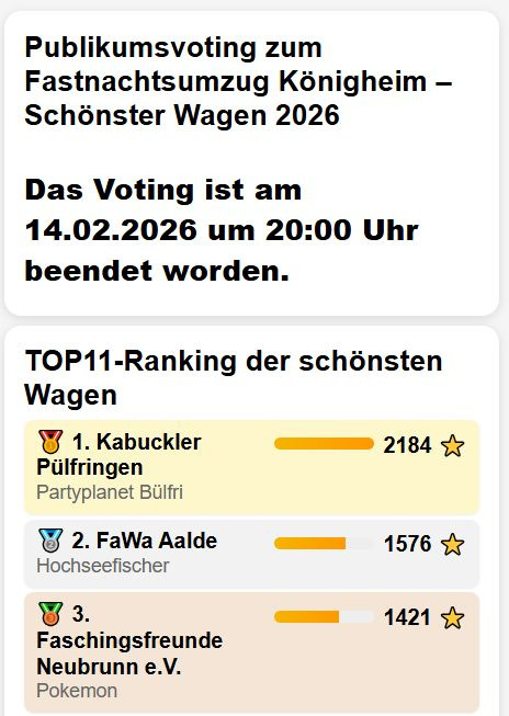 16.02.2026 | Das närrische Endergebnis unseres erstmalig durchgeführten Publikumsvotings steht fest – und wir sind begeistert: Über 2.000 Teilnehmerinnen und Teilnehmer haben abgestimmt. Wahnsinn! Danke für eure großartige Unterstützung!